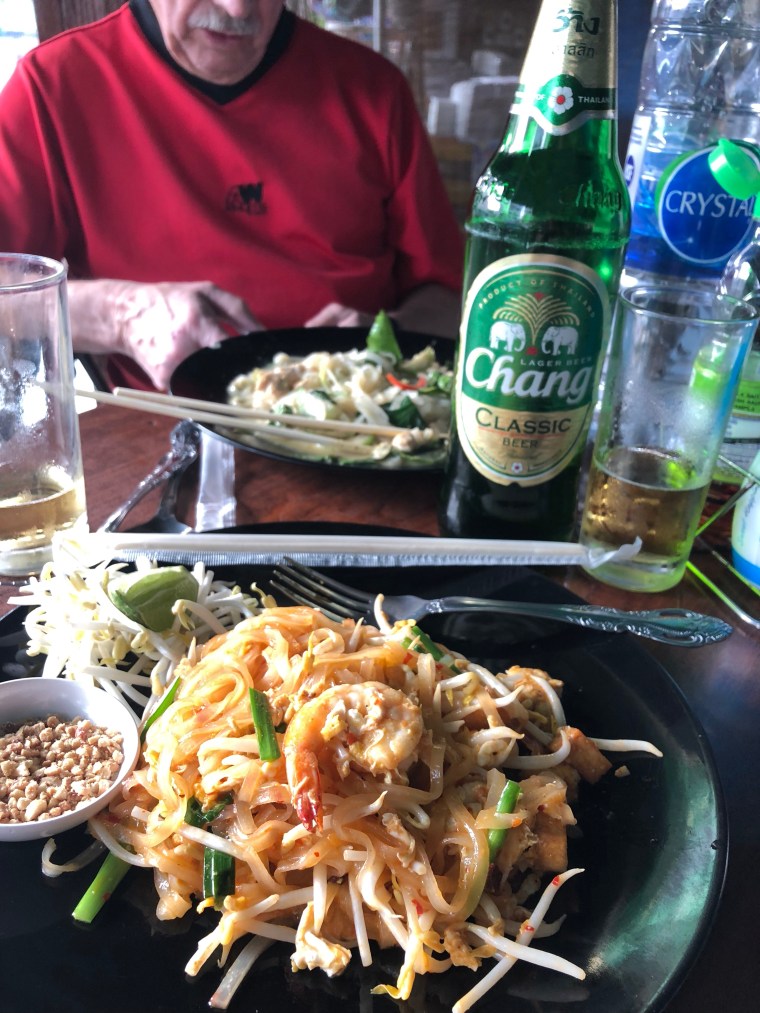 Authentic local cuisine here, but didn’t try it until later in the afternoon. I had Green Curry noodles with chicken and Joanne had ‘Pat’ Thai with shrimp. That is how it was listed on the menu vice ‘Pad’ Thai. We split 1 large beer since the waiter never brought us the 2 we ordered. Instead we got 1 large with 2 small glasses. Our full dinner with beer cost us 179 Thai Baht, the equivalent of $7.00 Cdn.