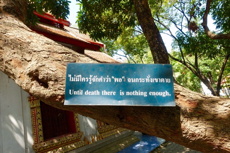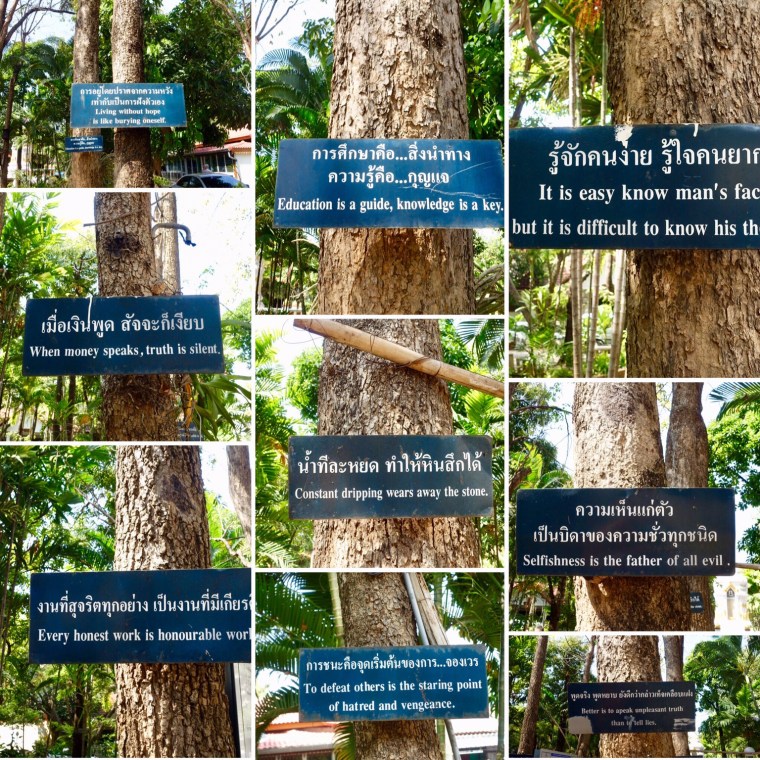 Many buildings and beautiful gardens on the grounds of this Wat. There was one garden that had sayings nailed to every tree. Really good sayings.