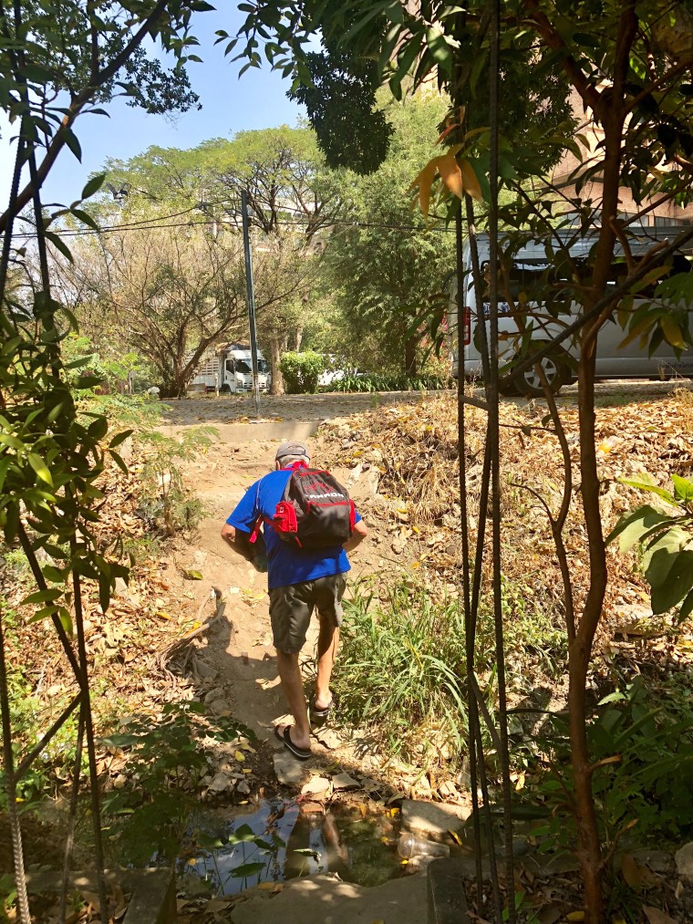 By now it was noon and HOT. Since we were in this part of town we thought we would walk to the shopping district where there was supposed to be a mall. Punched the name of the shopping street in the app maps.me. It was a little over 2 kms away but we would just take our time and try to stay in the shade. What shade? Not sure where maps.me was taking us but we did not end up in any shopping district that we could see. Did another search and found the mall and hit start for the route on the app. It took us down a dead end street and had us walking across a creek on rocks. Maps.me works great sometimes but not always the best route. Made it across the creek and up the other side.