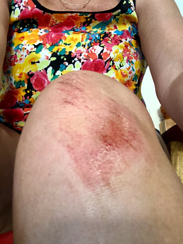 Doug continued walking as did I, but I was trying to orient myself with maps.me and figure out where to go next as we seemed to be in another dead end area and an entrance into some random building, not a shopping mall. Next thing I knew I was stumbling everywhere and landed on the ground. Some poor man saw it happen and came right over to ask if I was okay. He was saying there was a clinic just down the street. Took me a couple of minutes to get myself together and get up. Injuries weren’t too bad. I was pretty dirty as I fell in dried up, dusty mud and gravel. Both hands had a few scraps and my left knee was pretty scraped up and very dirty. Many tiny slivers of rocks under the skin. We had lots of first aid supplies in our backpack so I cleaned it up a bit and figured we would get to the washroom in the mall and give it a good clean. Thank goodness my camera had been closed and my phone was in my hand. No damage to either item. All I could hear in my head was Paden saying “watch where you are walking!” We spied a Starbucks just outside the mall and thought I could go into the washroom, clean up and then enjoy a nice iced coffee. Wrong! Starbucks over here don’t seem to have washrooms. Over to the mall we headed and found the washroom. Well no paper towels or toilet paper in there to do any cleaning with. Back to our backpack for more cleaning supplies. We had sanitizing wipes, polysporin and bandages in it.