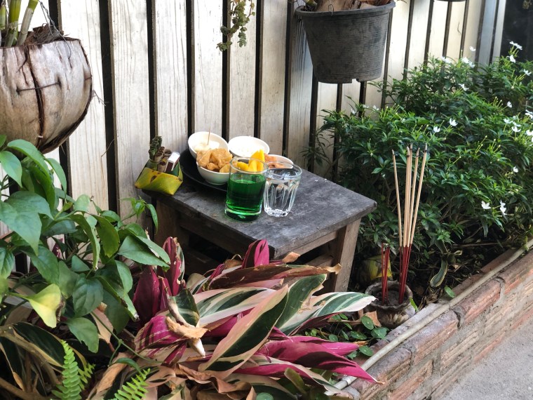 It was delicious as usual. At the restaurant, every morning the girl would put out the offerings around 10:00 am. 3 beverages of assorted colours and I think 3 or 4 small bowls of food. At the first one she would place 5 sticks of incense and the second one would only put 1 stick of incense. It was quite the ritual with her saying what we assumed was a prayer at each placing. She also would remove her shoes before kneeling down to place anything. You could find similar offerings at almost every business, many of them just on the street.
