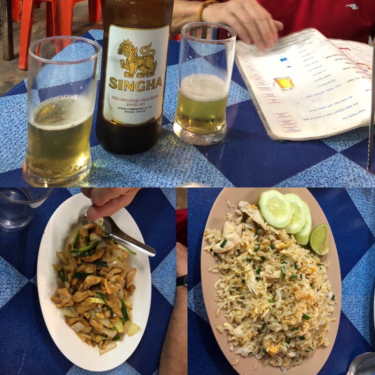 After a bit of a rest we decided to head out to get dinner. The hotel I booked turned out to be in a more residential area of Phuket and not in the old town. There were many restaurants in our area but definitely all Thai and local foods. Not much English spoken here. We picked one and ate. Doug had cashew chicken and I had fried rice with chicken. They had no Chang beer here so we tried the other local beer, Singha. I didn’t like it.