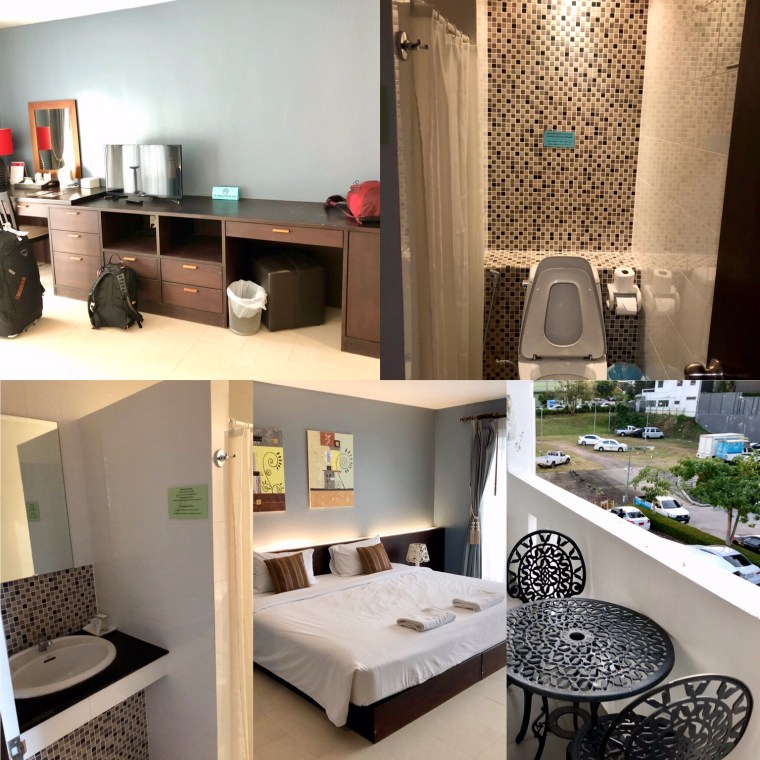 Landed and got our luggage. Headed out to get a taxi to our hotel. What a nightmare out there. People and taxis and taxi booths everywhere. Taxis here seemed expensive as they were quoting us 650 baht. (Approximately $27 Cdn). Turned out Phuket town is far from the airport. Took a good hour to get to our hotel. Seems like it is always rush hour everywhere. Got checked in. Our room was on the third floor and once again no elevators and no air conditioning in the hallways. The girl helping with our luggage was just a tiny thing, but she and I carried my big bag up together. The room was large and air conditioned.
