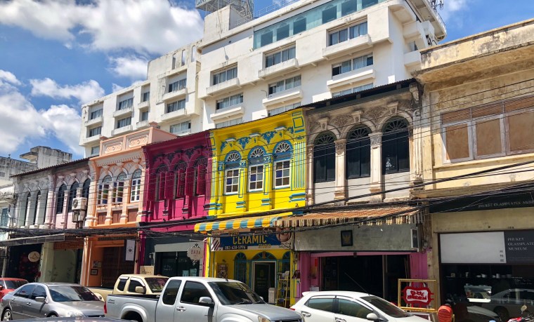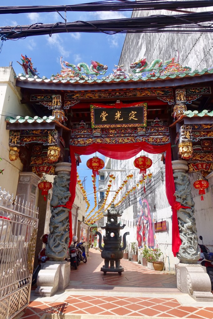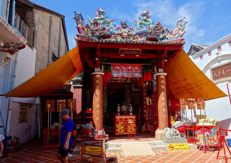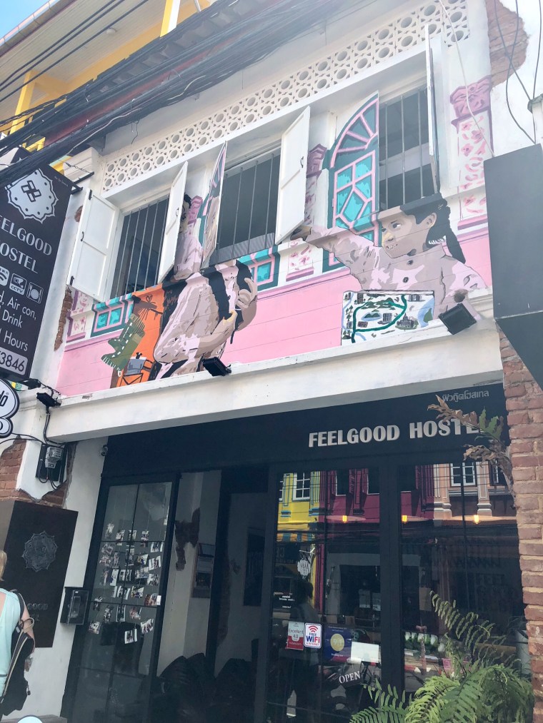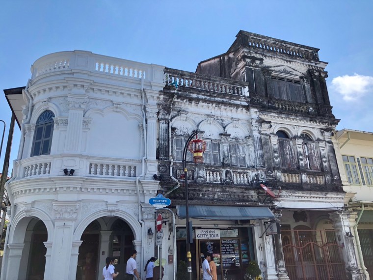 Woke up this morning and really didn’t have a plan. We didn’t know how to get around this place. The front desk tried to explain the buses in their broken English, but we still didn’t quite get it. We thought we would try out the bus ‘system’ and go into the Old Phuket Town. Headed down for the breakfast that was included, which turned out be sliced white bread, some local dessert wrapped in banana leaves, little pastries with maybe a meat mixture in them, coffee and tea. Skipped breakfast here. Thought we would just grab something in a restaurant as we walked towards town looking for the bus stop. We had to take the pink bus #1. Ha Ha. That didn’t quite work out either, however we did grab a smoothie at a street stall. I had orange pineapple and a Doug got a banana strawberry. They were huge and thick. We both only drank half. Still no bus stop and we figured we must already be over half way to town. It was a 2.7 km walk. Have I mentioned lately how hot it still is here! We finally came upon a bus stop but figured it wasn’t worth it now and continued walking. In many places the sidewalk could barely be called a sidewalk.