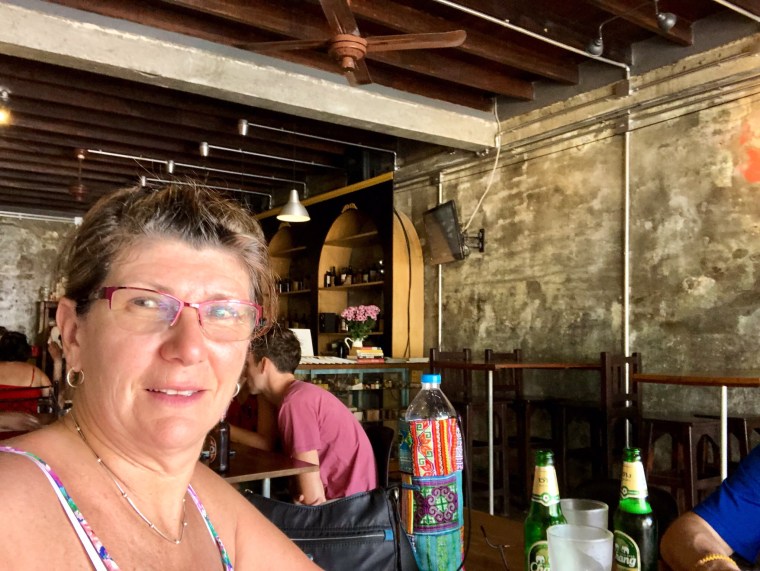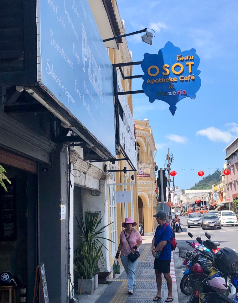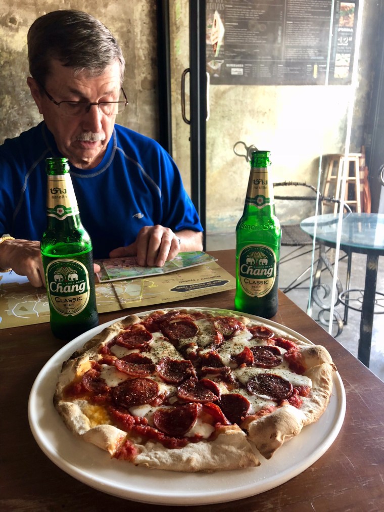 By now it was almost 1:00 and we were getting hungry. We saw a sign saying pizza. That sounded really good right now so we went over to investigate. Couldn’t tell at first if the place was open or not as the windows were tinted, but we looked closer and saw it was doing a great business. Full of tourists! My kind of place. This place turned into one of our best finds so far on our trip. We ordered Chang (surprise surprise!) and a pepperoni pizza. The ice cold Chang, pizza and service were amazing. Bill was about $15 Cdn. Not bad. Highly recommend this restaurant, OSOT Apothoke Cafe & Pizzeria for anyone traveling to Phuket.