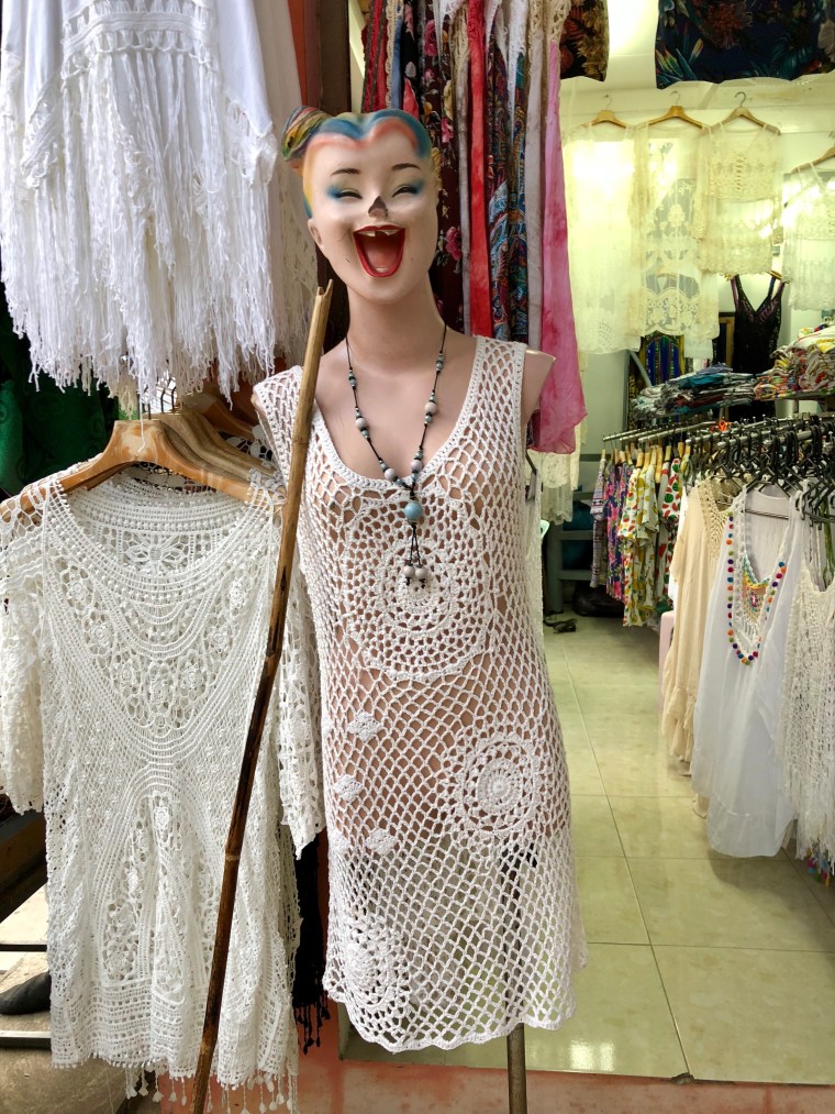 Did a little shopping in the market. Doug wanted a Thailand flag for his backpack and I wanted a larger waterproof bag. The one we brought was only 5 litres and I found it a little small. Saw this beauty. Wouldn’t she entice you to purchase her outfit?