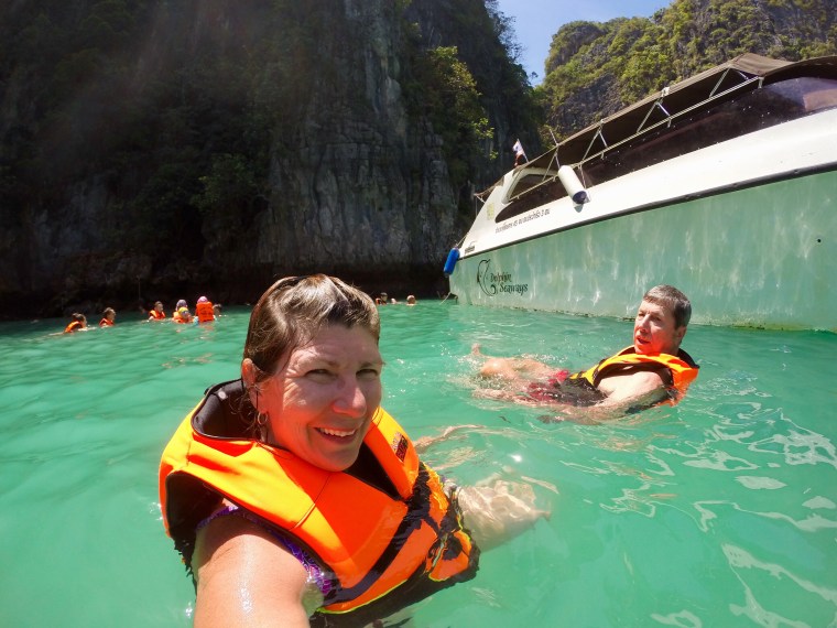 We stopped at a snorkeling spot but I have no idea what the name was. It was either Pi Leh Bay or Loh Samah Bay. We only did one snorkeling spot as we didn’t do the last one at Shark Bay. We had already turned our equipment in and didn’t want to get someone else’s. No sanitizing going on here. As far as the two Bays go I have no idea which was which from my photos. Most of the snorkeling is on video but here are a couple pictures. Not easy trying to take a selfie with a Go Pro!