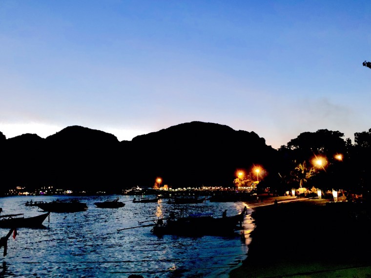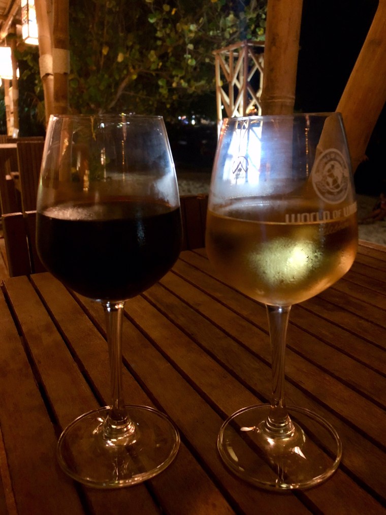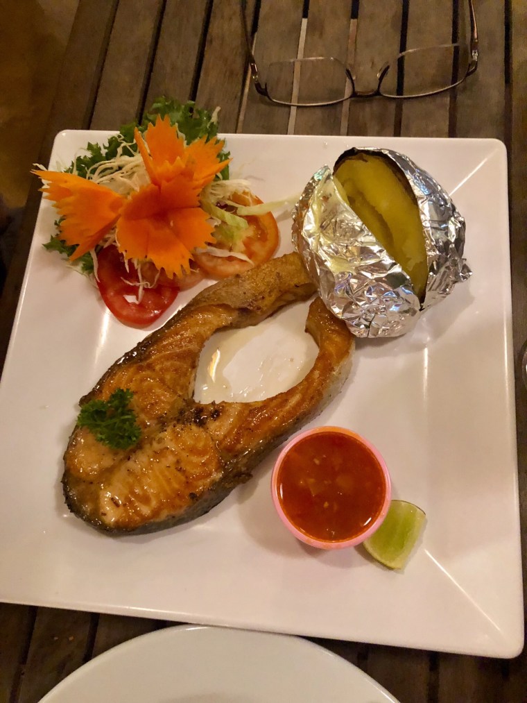 We had seen some really nice restaurants along the beach and decided we would return to one for dinner. I picked out the one I wanted to go to as they were BBQing chicken kabobs that looked delicious. Later in the evening we headed out for dinner. We walked for what seemed forever. Back and forth and could not find the restaurant with the kebobs. Next time I need to take a picture of the name. We both came to the conclusion that the kebob restaurant must have been up and around the last hill we had walked around in the morning. We weren’t going to go that far in the dark. So we settled on another beach side restaurant, Chao Koh. We both ordered a glass of wine and salmon fillets. Everything was really good.