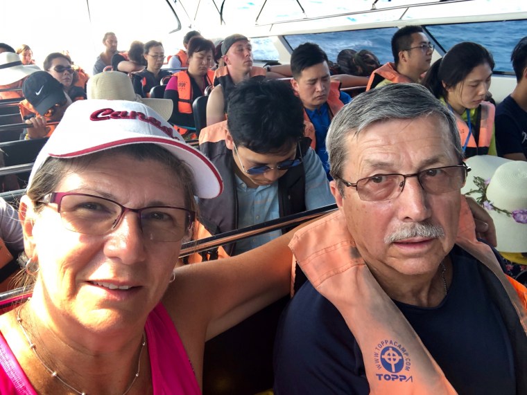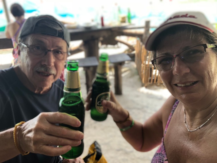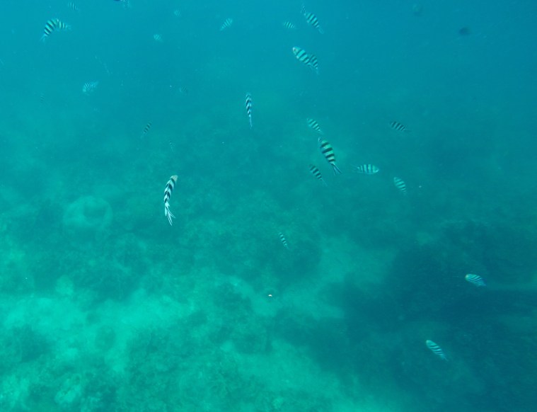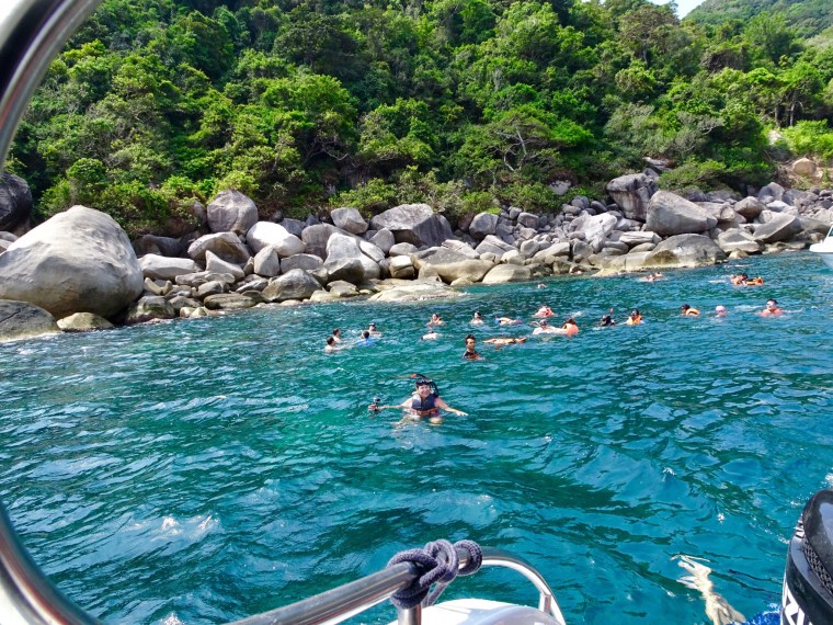 Snorkeling equipment distributed. Doug decided not to snorkel after seeing their equipment and hygiene. I opted to do it anyways. At least I got a new mouthpiece on my snorkel. We had an hour stop. I usually jump in the water off the front side of the boat, but I couldn’t stand to do it as there wasn’t really any place to put my feet. The very front of the boat still had too many people there.