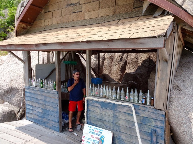 After eating my lunch I stood up to head to the washroom when disaster struck…….my orthotic flip flop blew apart. Yup, it came unglued from between the upper and lower soles. Both of us thought I took pictures of the blow out, but I guess it was such a devastating event that I didn’t. Okay, there must be a shop on this tourist island! We went in search, me hobbling along with a broken flip flop, until we found the ‘check in’ desk of the ‘hotel’. There was a little shop, but it was locked and no one around except our sick Israeli guy from the boat.