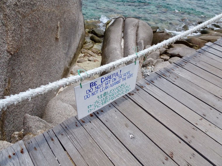 An amusing sign to us. The drop off was between 15 – 20 feet down onto rocks.