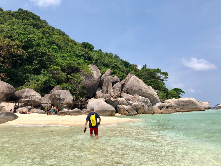Since we didn’t climb to the look out point we headed back to the beach and decided to walk across the peninsula. Since the tide was in, lots of it was covered by water. Don’t let the white sand deceive you. It was made up of sharp broken shells and coral. It was so hurtful on the feet. Really wished I had my water shoes.