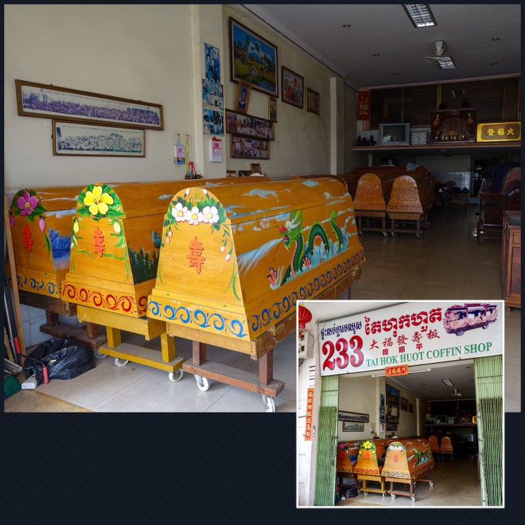 We headed back to the travel agents office that we had been at yesterday and booked our car and driver to go to killing fields along with a few other places tomorrow. Caught a glimpse at this shop on our way. Beautifully painted coffins.