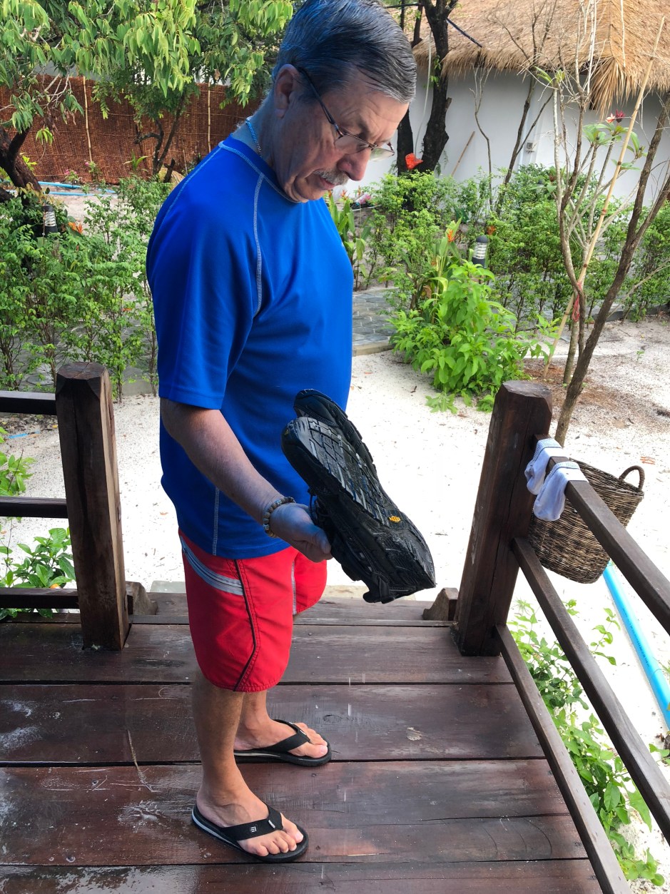 We decided to walk to the far end of the beach, passed the dock where we disembarked yesterday. We had to navigate large troughs of water runoff from the mountains as a result of last night’s storm. This water was brown and probably laden with bacteria. Guess these troughs always occurred in the same locations, as we found flimsy, wooden foot bridges erected up near the tree line on which to cross. It was so disappointing to see all these brown waters, as Paden had told us this island had some of the cleanest, most beautiful beaches he had ever seen. After talking with the owner of the resort, it turns out that the storms stir up all the jungle debris and it washes down the hillsides into the ocean after these bad storms occur. Bad timing on our part.