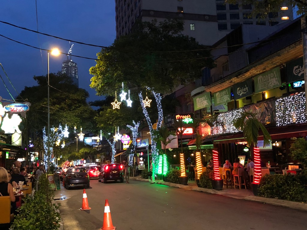 Yesterday, while looking out our hotel room window I spotted a party street a block over, so tonight we went to check it out on our way back from picking up a couple of shawarmas for dinner. Up at the corner on one of the main streets, we saw an older homeless type guy sitting, strumming and singing “West Virginia Mountain Momma!” The John Denver, Take Me Home, Country Roads song. We couldn’t believe our ears and immediately thought of our cruise friends, Karen and Will who live in West Virginia. Guess I was in such shock that I forgot to take a picture of him.