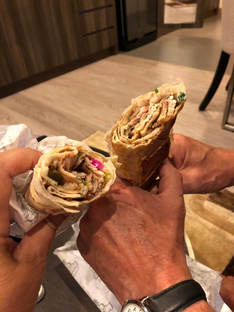 Back at hotel – ate shawarmas and Doug enjoyed a glass of wine.