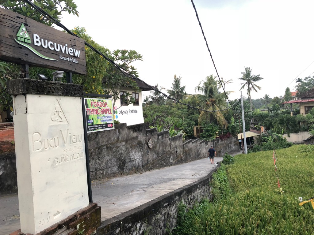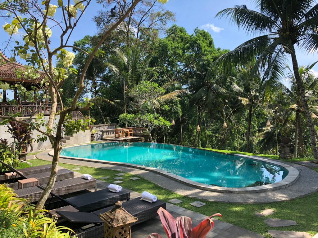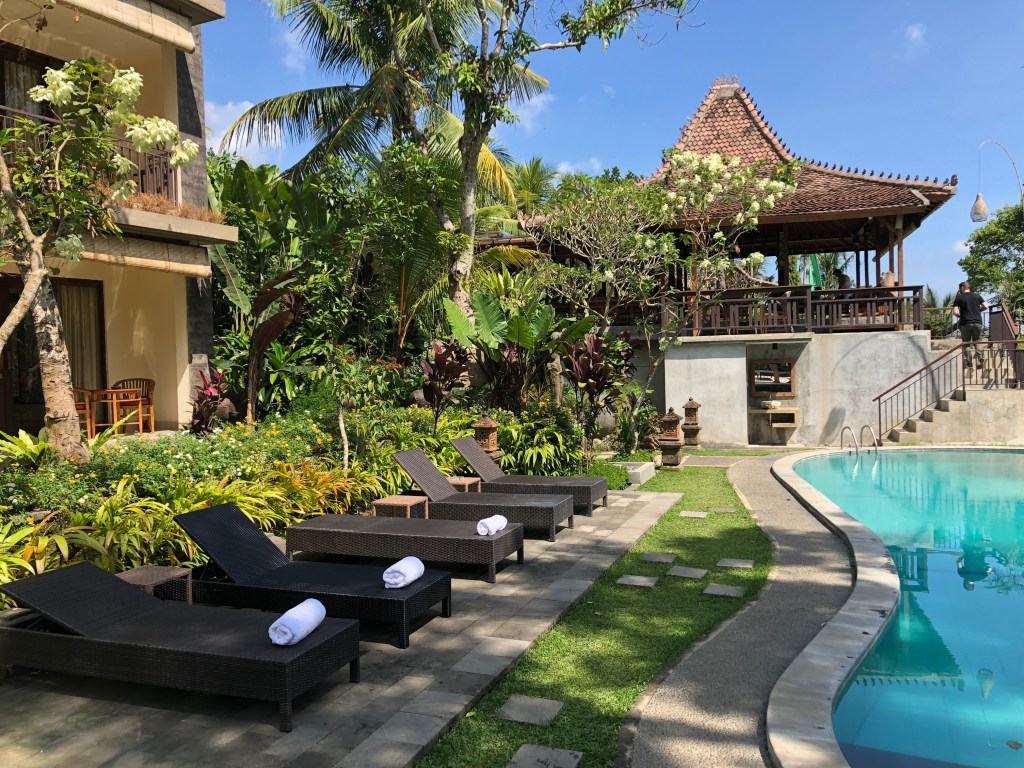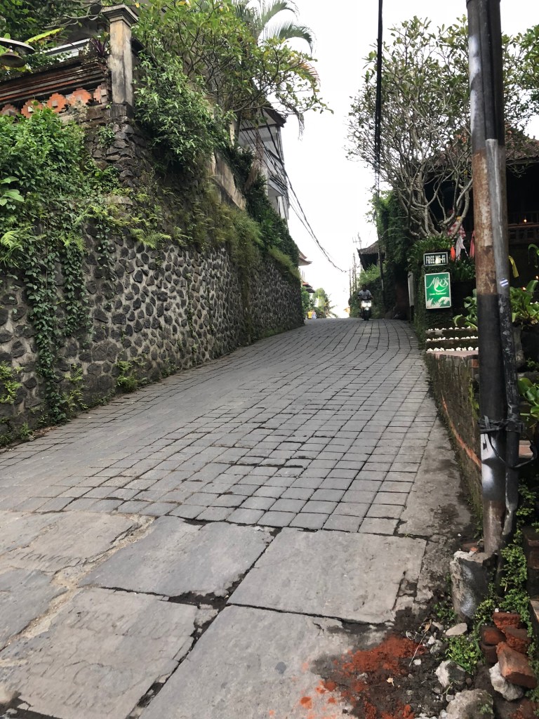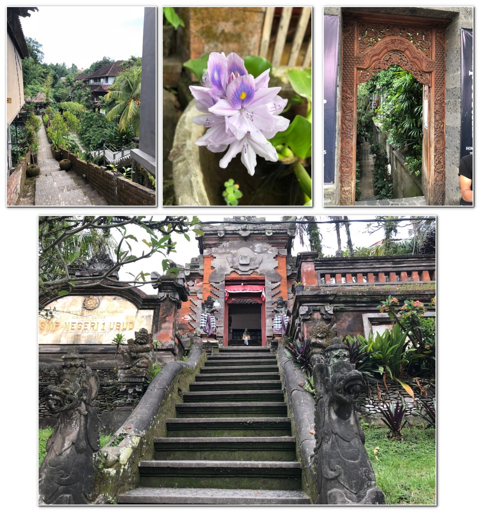 We turned off the main road and proceeded along a very hilly, rough ‘road’. We came to where we thought the road to our hotel was, but the driver was not going to risk driving up it. It was narrow, steep and curvy. We couldn’t tell for sure if our accommodations were even on it. We unloaded and proceeded to walk up the ‘road’. For every down hill there seemed to be an up hill also. 100 M sure can be far at times. We had made good time and had arrived in Ubud by 1:30. We have to laugh now as it is approximately 26 km (16 miles), but seemed much further when driving over here. Can you imagine taking 1 1/2 hours to go 26 km back home? And thinking you had made good time!!