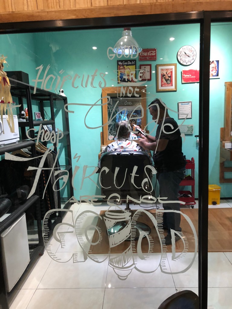 We got to town and stumbled upon a barber shop. Doug had been wanting to get a haircut for a while now. He was going to chance it. Really, how can you mess up a man’s haircut? There was an Aussie guy in the seat next to Doug that had the most beautiful long blond curly locks. I really wanted to take a picture of him, but that probably would have been a little weird, even for me. He wanted ALL the curls cut off. He wanted his hair short. His poor barber was terrified of cutting his hair. The client kept telling him to cut more and more off. Doug’s barber just took the shears to Doug’s hair and sheared away! The sign on the window was amusing. GOOD Haircuts ARE NOT Cheap, cheap HaiRcuts ARE NOT GOOD
