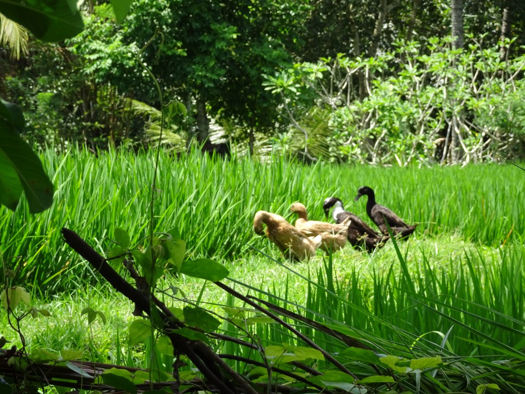 As we were headed back we heard some quacking going on in the rice field. We thought Ted and Susan had followed us over here. Ted and Susan are a pair of ducks that have been coming to our pool for the last 8 – 10 summers. They don’t have their nest in our backyard, but come for their spa days and hang out. Swim, sleep and eat the bird seed and cracked corn. They even get their own food and water bowls placed in the shade for them. LARGE ones. We use large plant saucers for them.