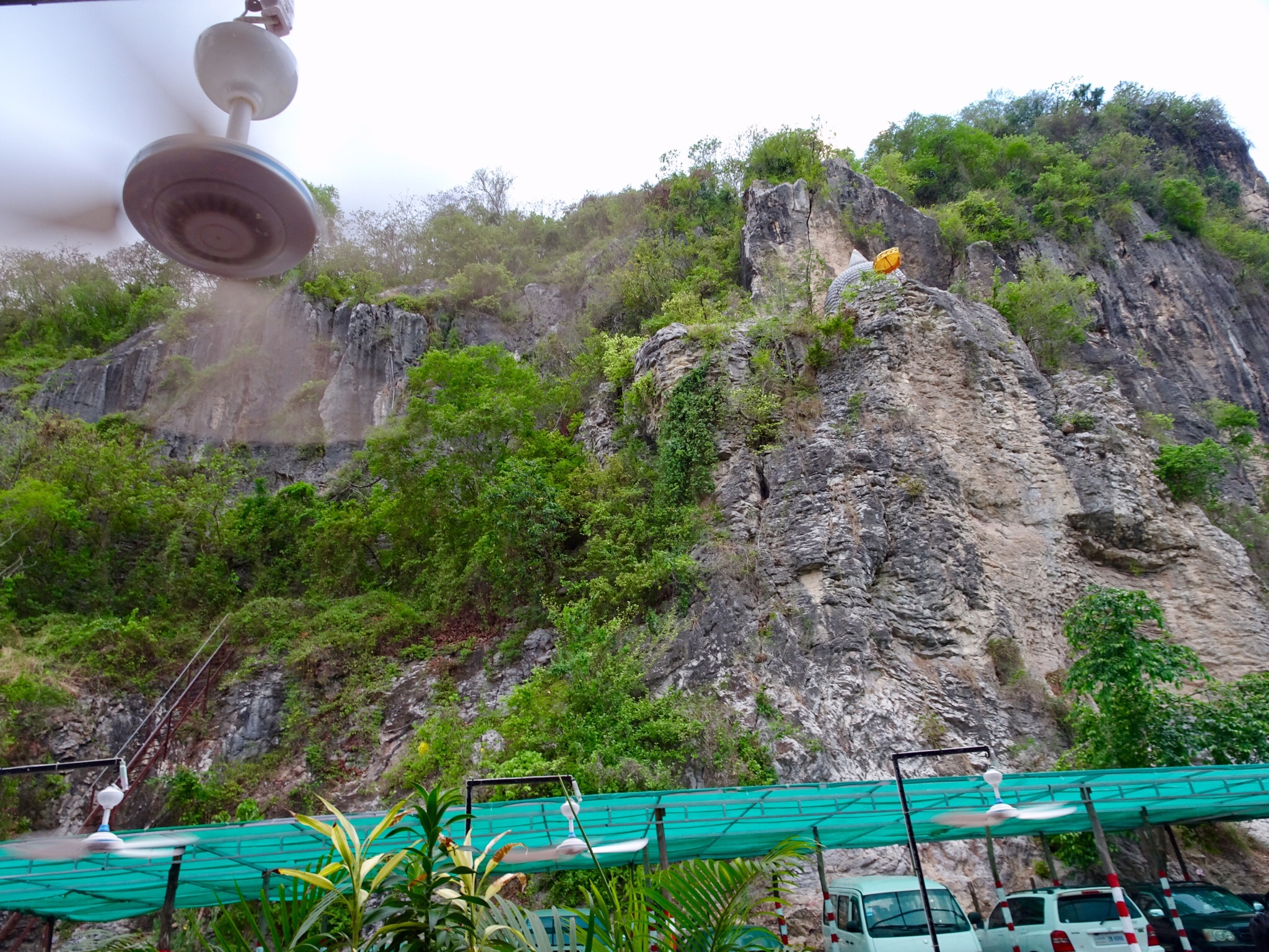 Once again the pickup came back for us while dropping off a new load of people. Back down to the bottom of the mountain where we were steered towards an outdoor café with overhead fans, tables and chairs. They just happened to serve food and beer. We would now wait for the Bats to fly out of the mountain. Peter disappeared and so we ordered a beer and waited.