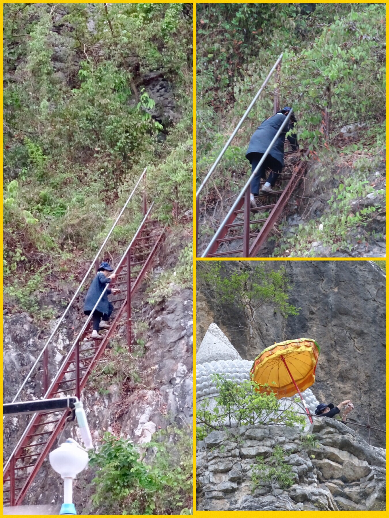 While we were waiting we saw a middle-aged Asian woman (dressed with a coat on) climb the steps up to the unfinished Buddha. The Buddha is in the upper right quarter of the first photo below. Peter had told us a little bit about it. The man who had been carving the Buddha fell to his death while working on it. No one has ever finished it since. I think that is partly because there is no money to pay someone to finish it. The steps may not look too steep but they were VERY steep. The Buddha is also very high. Out of all the hundreds of people there, no one else attempted to climb up. The woman climbed down the stairs backwards holding onto the rungs as she descended down. A very brave woman in my opinion and I don’t think this was her first time doing something like this.