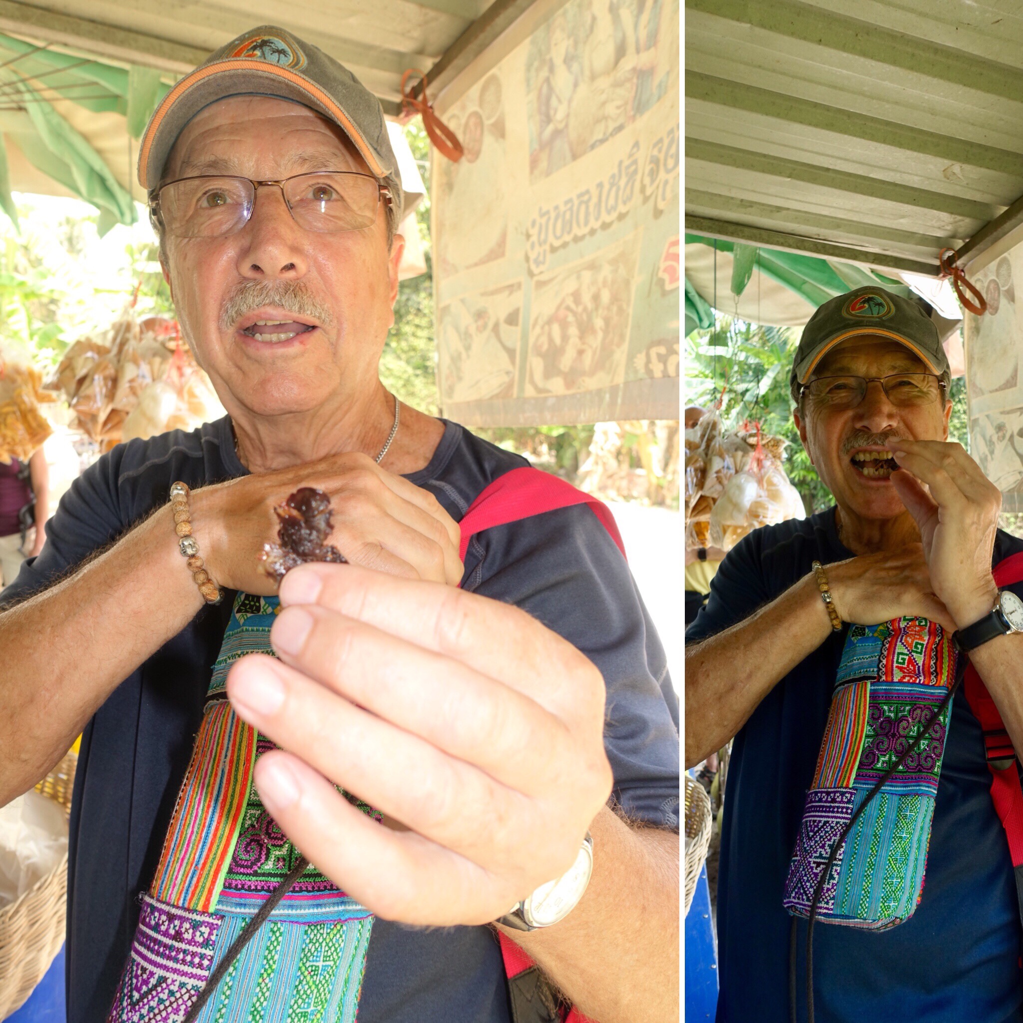 While I was ordering a fresh and a fried spring roll, Doug was chatting with a couple who were sitting at the same table as we were. Next thing I know he’s standing there with a piece of BBQ’d rat in his hand. He ATE IT!