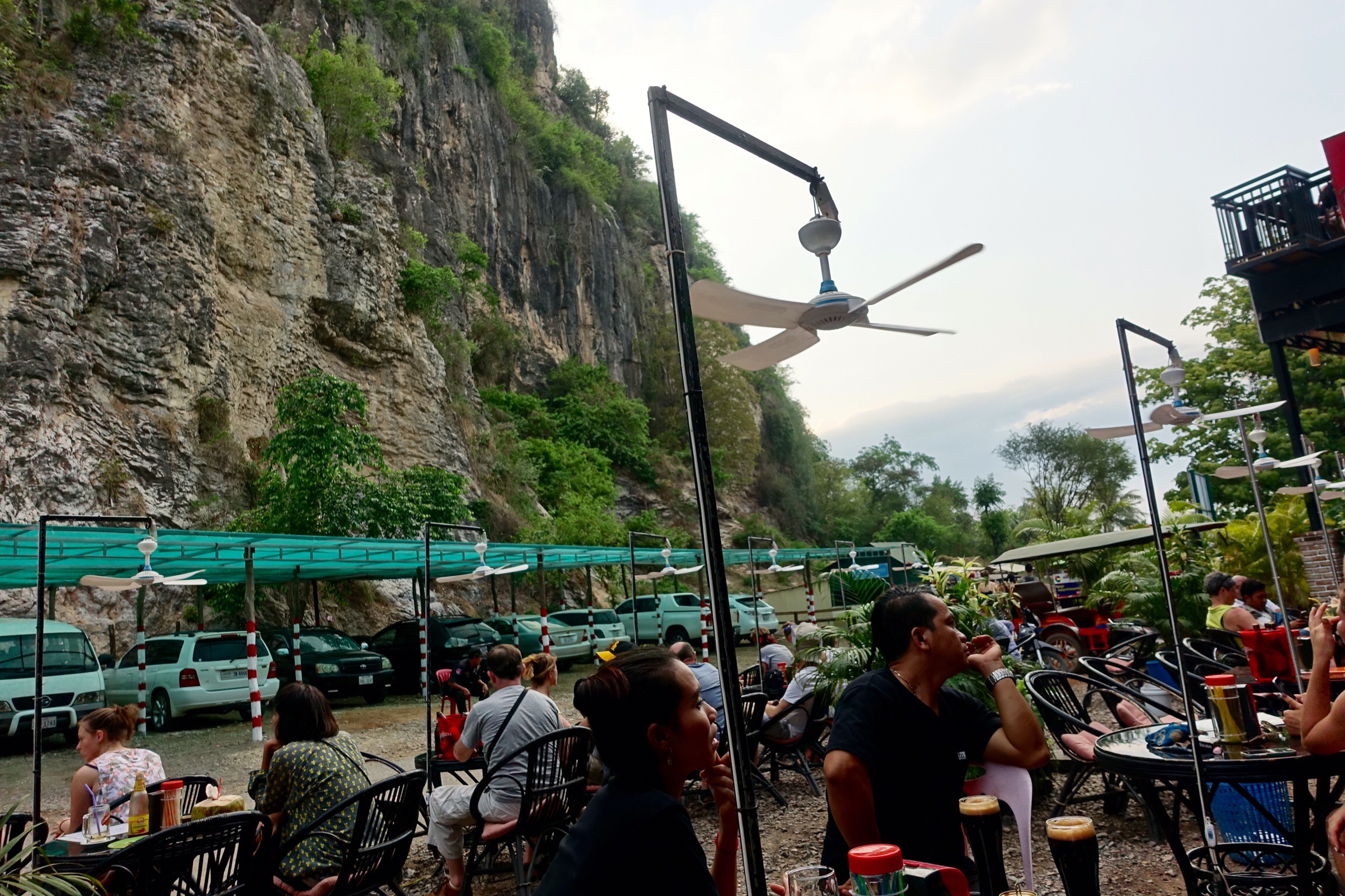 Once again the pickup came back for us while dropping off a new load of people. Back down to the bottom of the mountain where we were steered towards an outdoor café with overhead fans, tables and chairs. They just happened to serve food and beer. We would now wait for the Bats to fly out of the mountain. Peter disappeared and so we ordered a beer and waited.