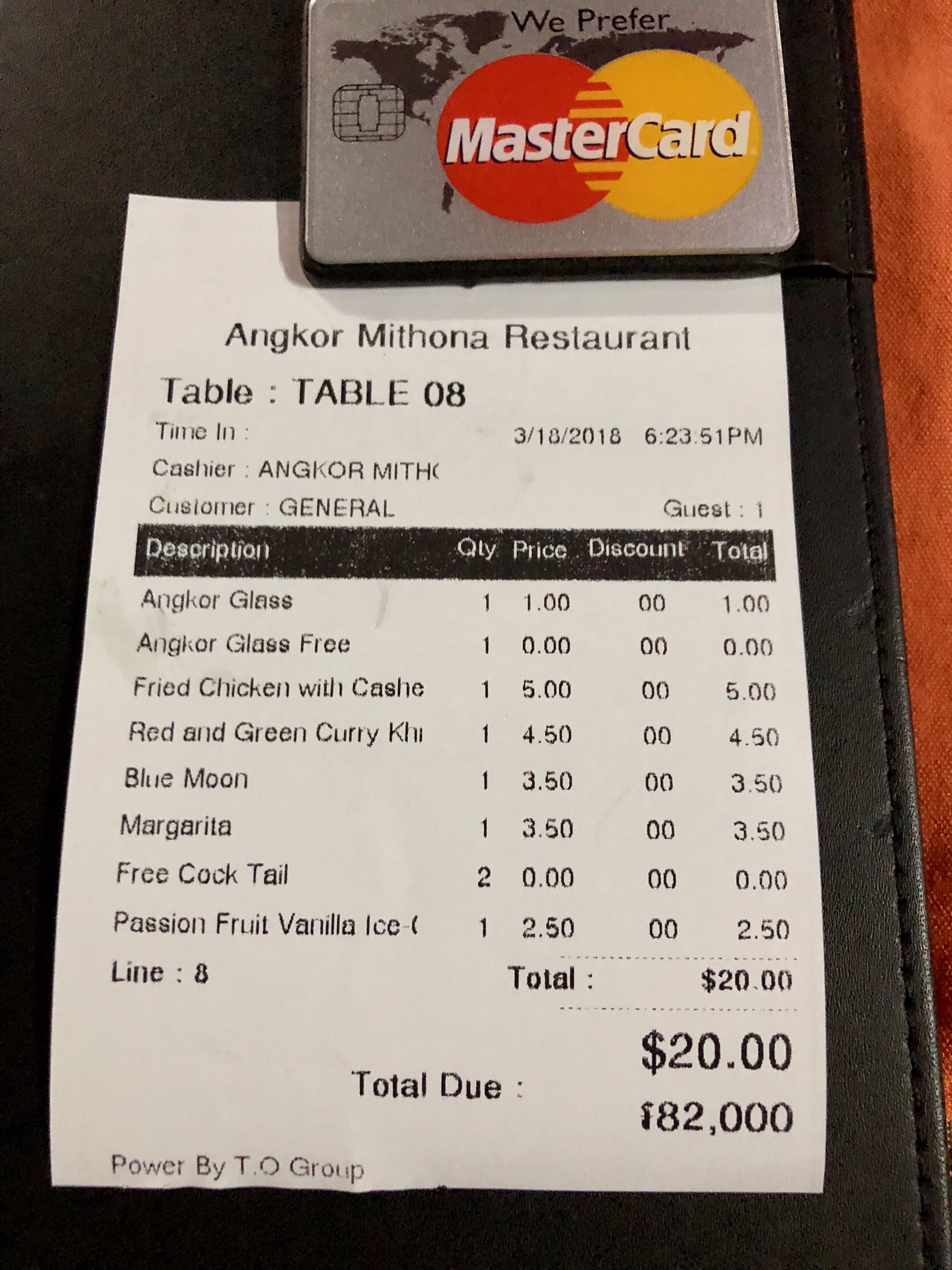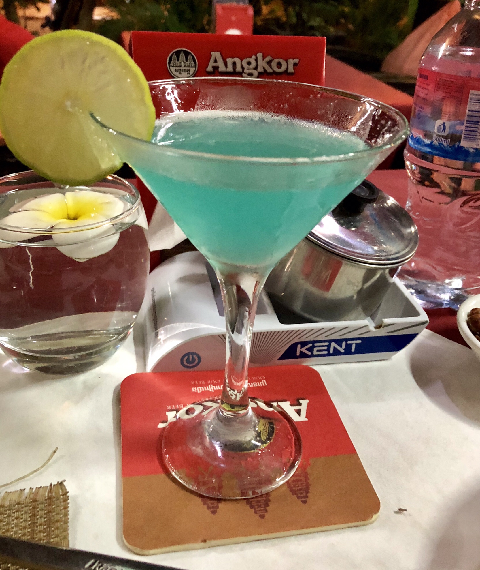 When we got back to town we treated our Tuk-Tuk driver, Peter to dinner at the Nary Kitchen. He picked this restaurant and he really recommended it. Funny thing was we had looked at it this afternoon for lunch but thought it was a cooking school. Turns out it is both. Doug had fried rice, vegetables and chicken. Peter and I both ordered the noodles with vegetables and chicken. Food was good. I also ordered a Long Island Iced Tea. Can’t say that drinks were their specialty.